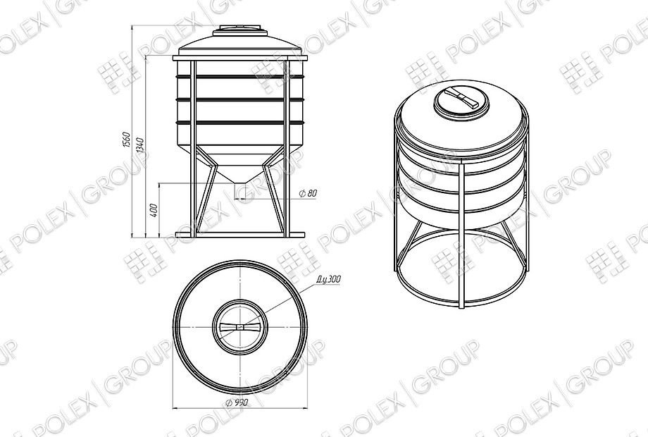 Емкость - бункер 500 в металлическом каркасе конструктивно представляет собой бесшовную, цельнолитую емкость цилиндрической формы вертикального расположения с конусным дном.