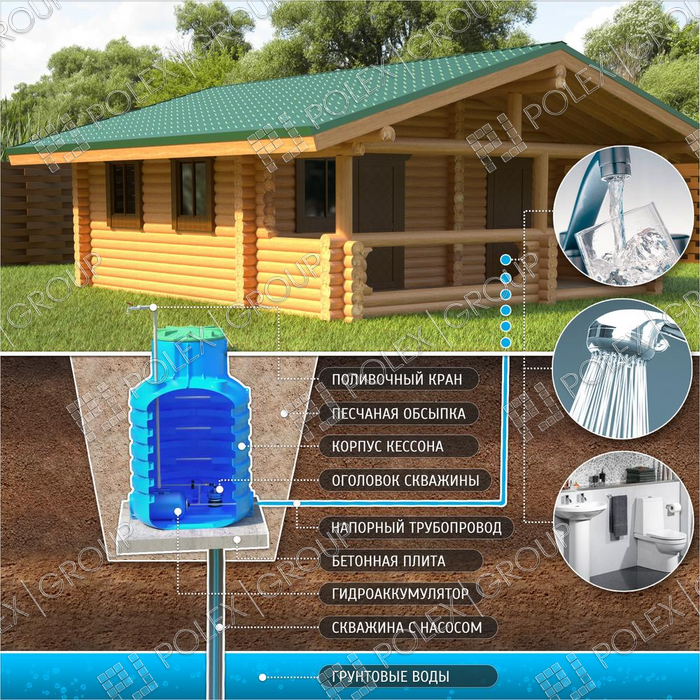 Основная функция кессона - защита скважины, трубопроводной системы от промерзания в зимний период времени, от попадания в скважину грунтовых и сточных вод, что нередко встречается при весенних паводках, когда грунтовые воды находятся близко к поверхности земли.