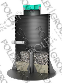 Фильтрующий колодец POLEX предназначен для очистки сточных вод после выделения из них взвешенных веществ в септике. Подвод сточных вод предусматривается на 0,15 м выше поверхности донного фильтра, на которую в месте падения струи укладывают антисептированный пластиковую поверхность установленную на полимерную трубу для равномерного распределения сточной воды по площади загрузки в плане и предотвращения ее размывания. Загрузку высотой 1 м устраивают из гравия, щебня, спекшегося шлака, осколков крупностью 10-70 мм.