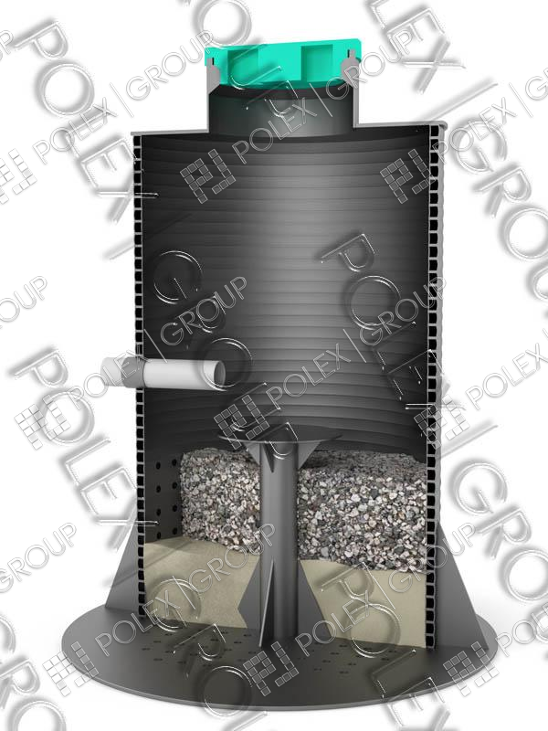 Фильтрующий колодец POLEX предназначен для очистки сточных вод после выделения из них взвешенных веществ в септике. Подвод сточных вод предусматривается на 0,15 м выше поверхности донного фильтра, на которую в месте падения струи укладывают антисептированный пластиковую поверхность установленную на полимерную трубу для равномерного распределения сточной воды по площади загрузки в плане и предотвращения ее размывания. Загрузку высотой 1 м устраивают из гравия, щебня, спекшегося шлака, осколков крупностью 10-70 мм.